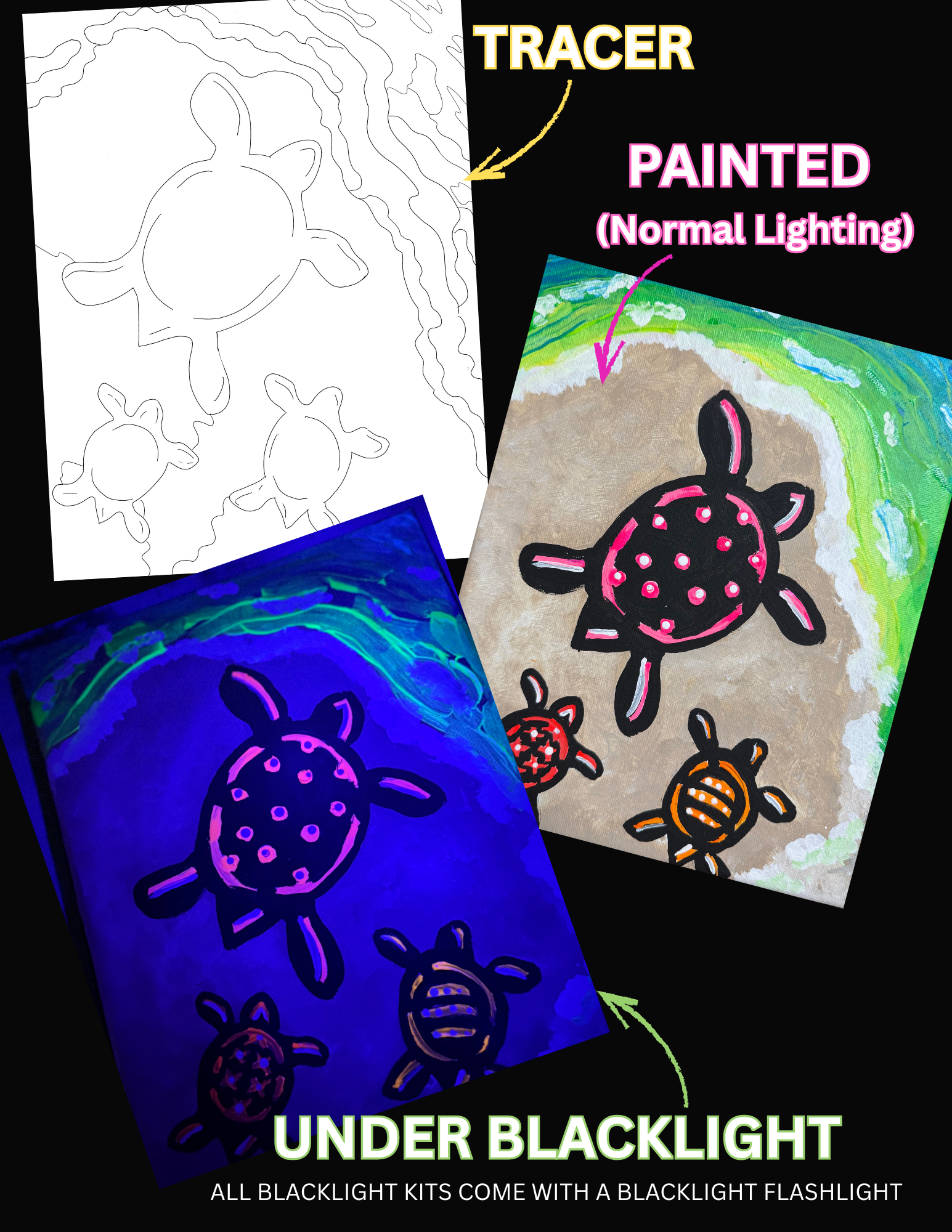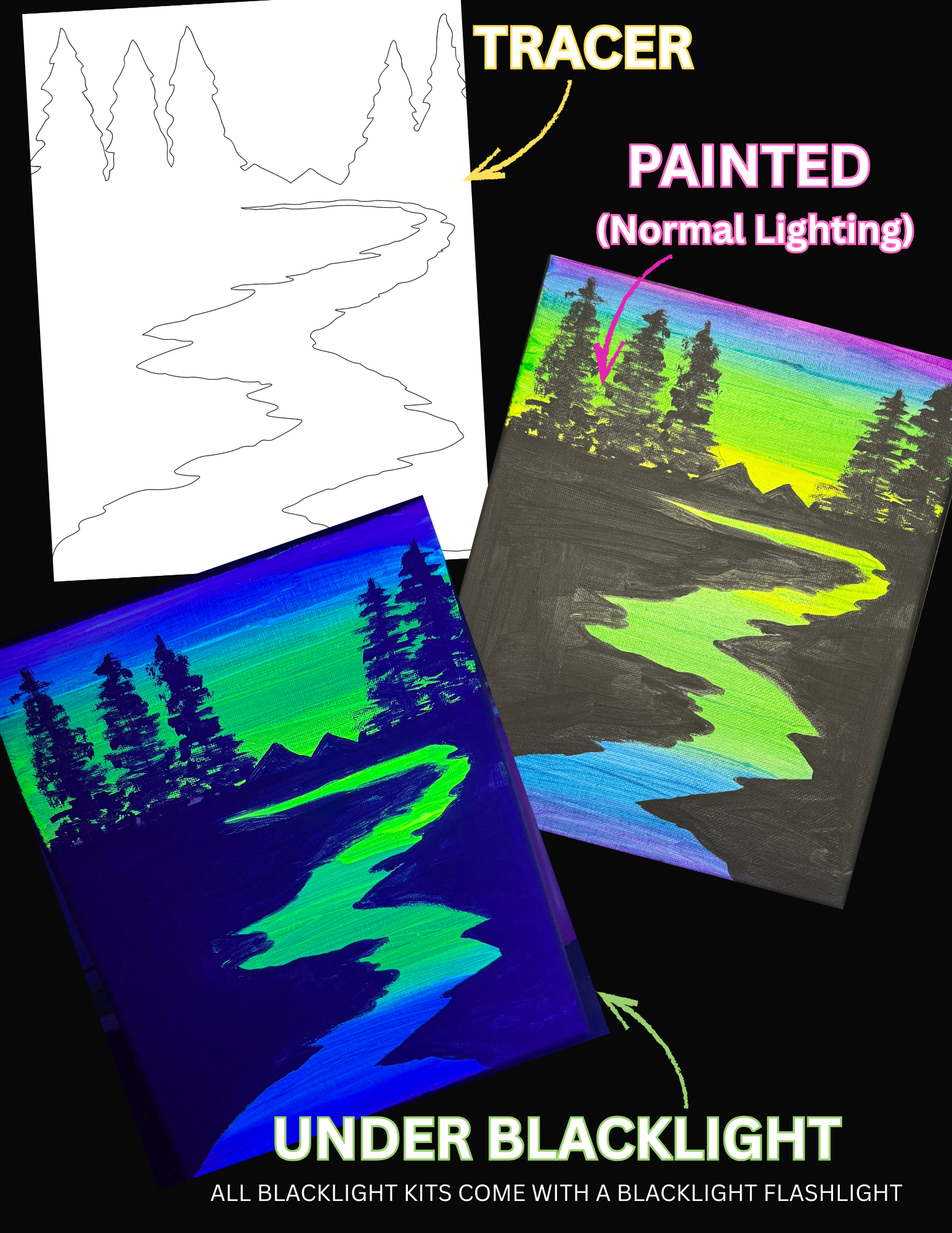 You paint these dramatic, high-contrast paintings with regular acrylic paint first, and then we've added a whole set of blacklight paints that you can go over the painting with to make it glow under the blacklight.