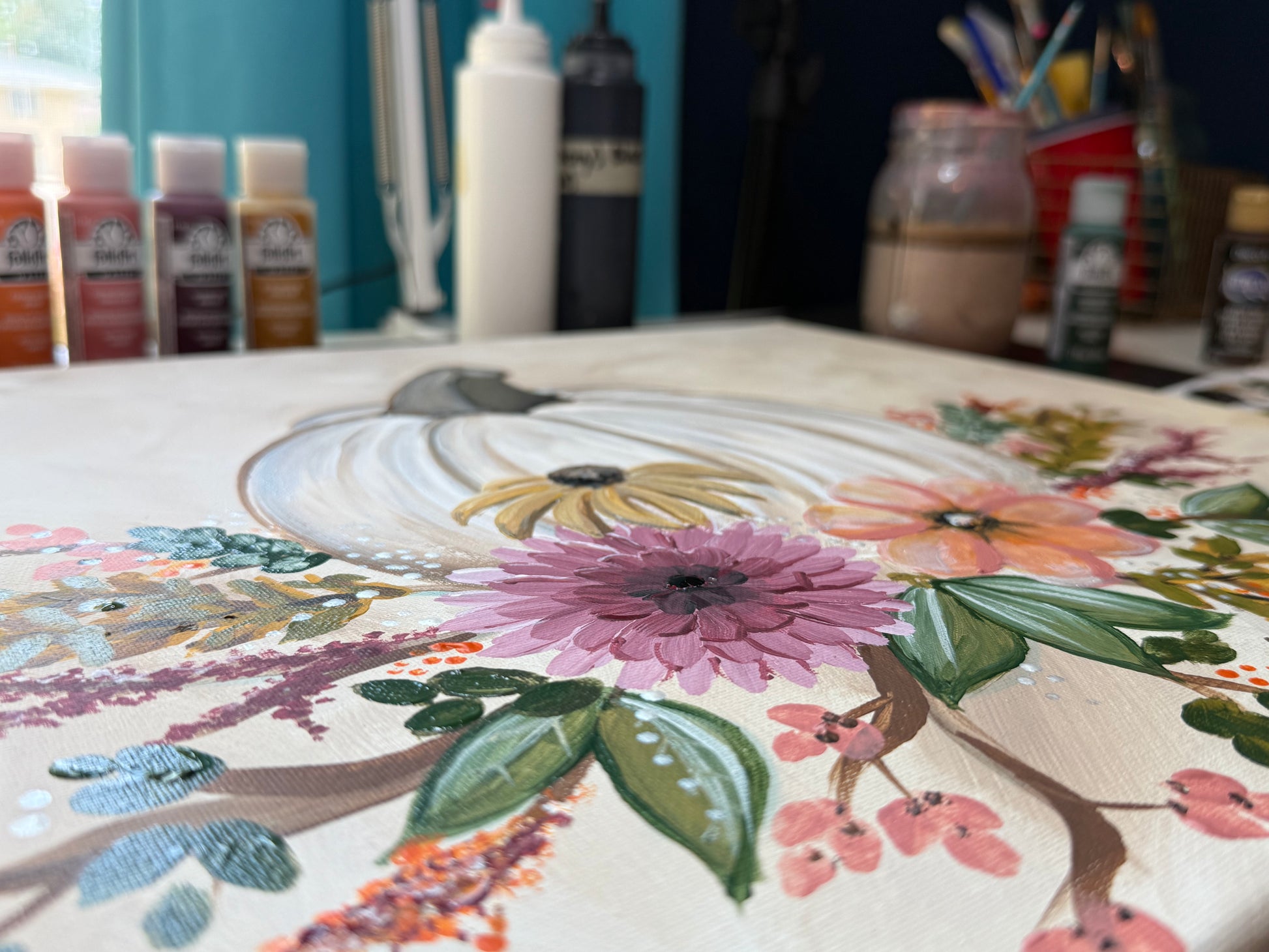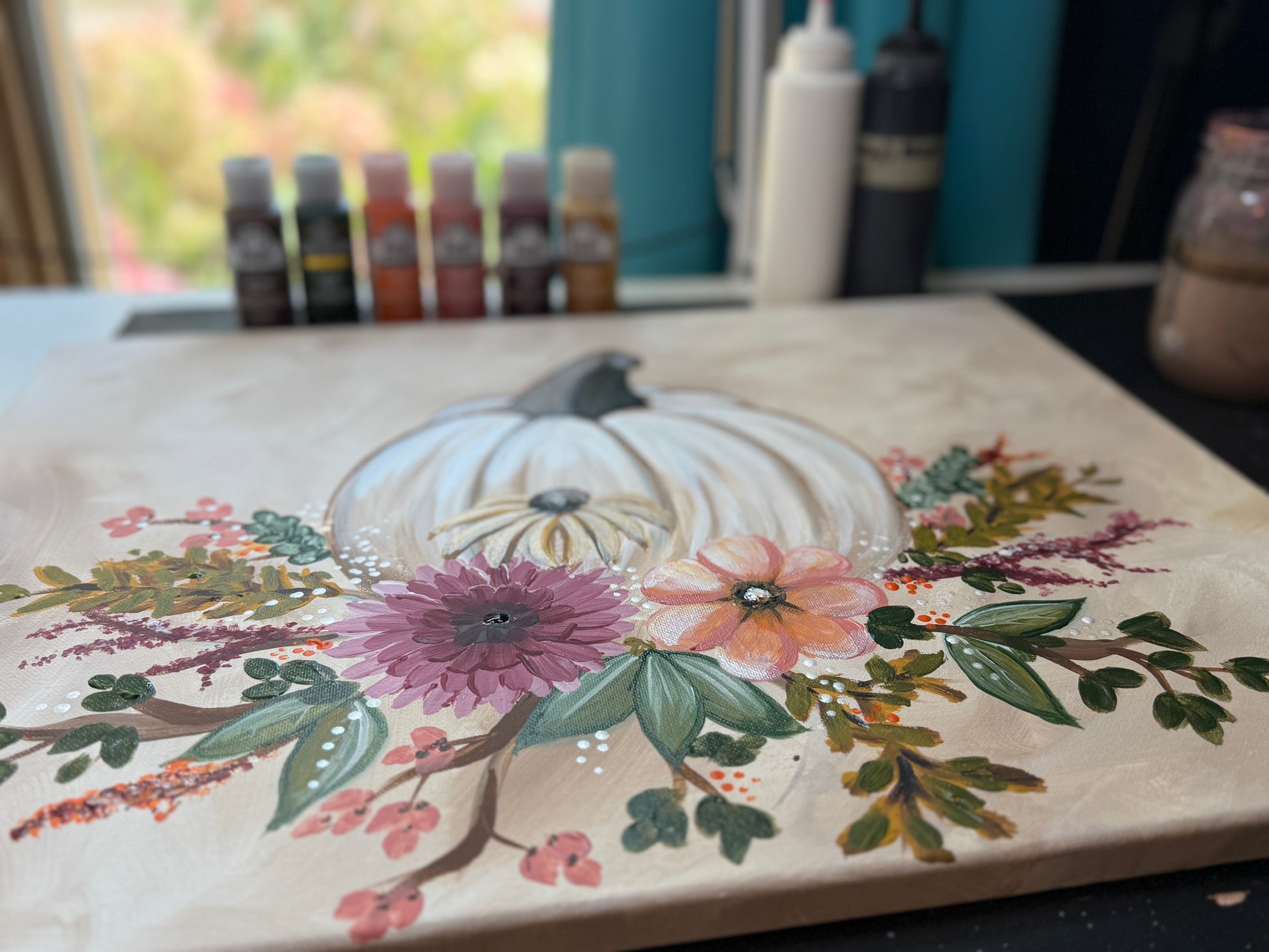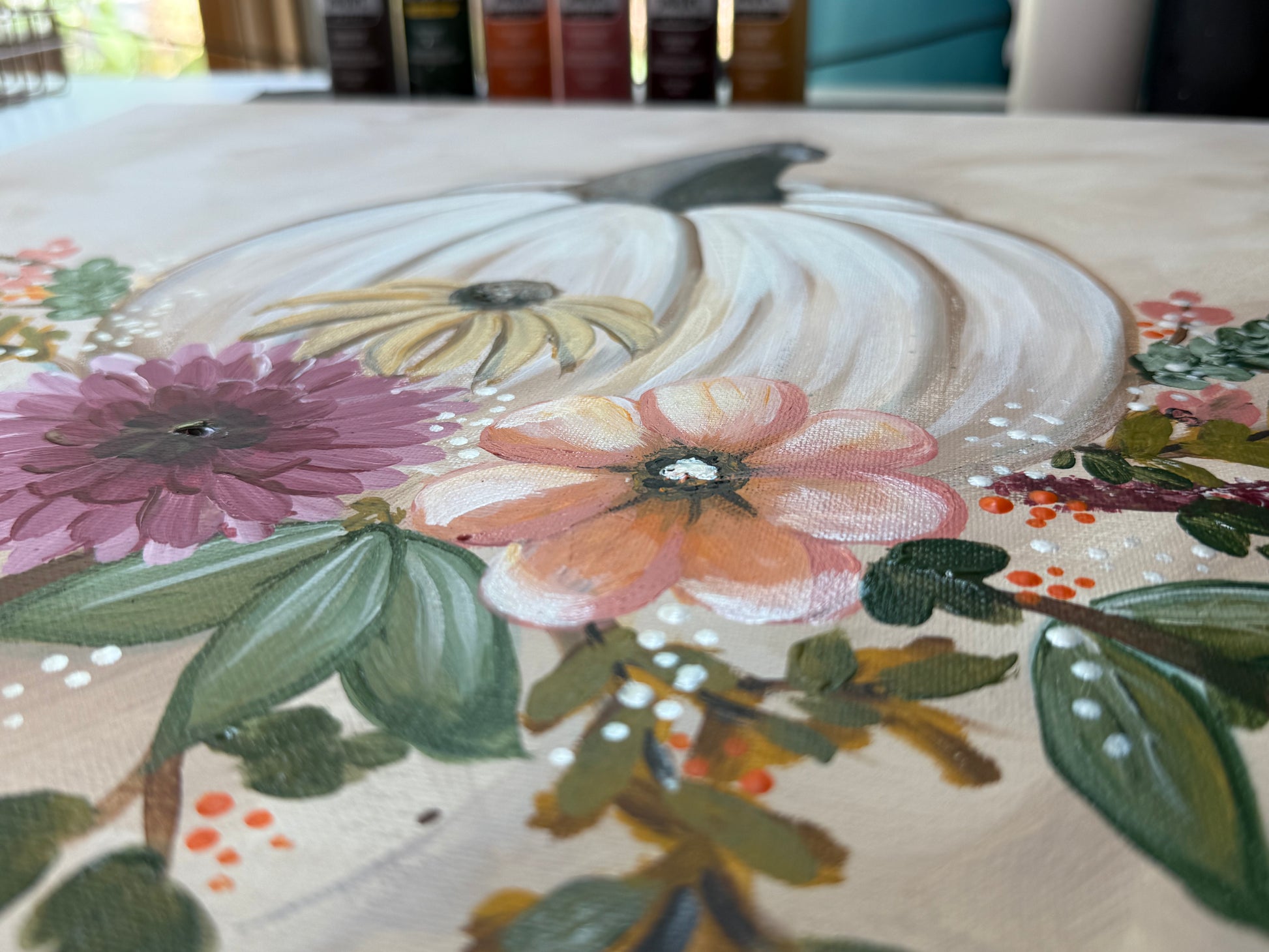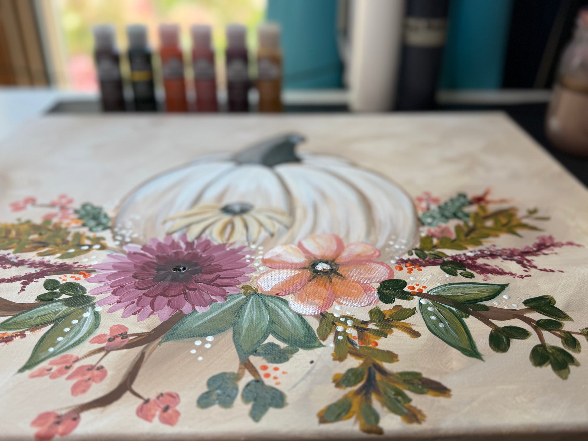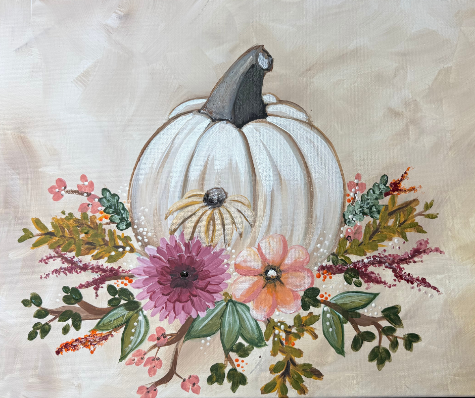 On this special evening, we’ll be painting an “Autumn Pumpkin” design with chic boho vibes—a white pumpkin surrounded by soft florals in pinks, oranges, and greens. This project is done on a large 16x20 canvas, making it a beautiful seasonal piece you’ll be proud to display at home.